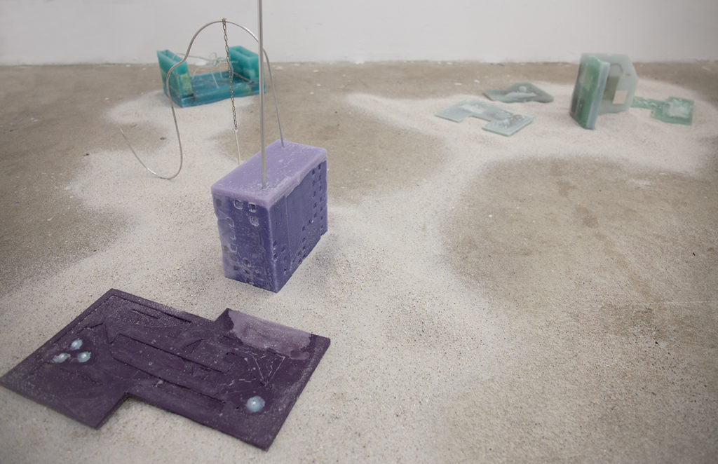In ihrer Serie Liquid Base untersucht Anna Bochkova den Einfluss vergangener modernistischer Utopien auf unsere Gegenwart, inspiriert von Bruno Tauts Sozialwohnungen und seiner Vision der „Alpenarchitektur“. Die Formen der Wachsskulpturen erinnern an maßgefertigte Paneele aus Fertighaussiedlungen, haben jedoch ihre eigenen einzigartigen Proportionen, die es uns ermöglichen, die Vergangenheit auf neue Weise zu erleben. Fragmente von Texten aus Bochkovas Kindheit sind in den durchscheinenden Körpern eingeschlossen, während Glas, Pappe und andere Materialien mit dem Wachs verschmelzen. Das Wachs bewahrt die Spuren von Bewegung, Raum und Erinnerung und schafft so dichte und komplexe Strukturen.