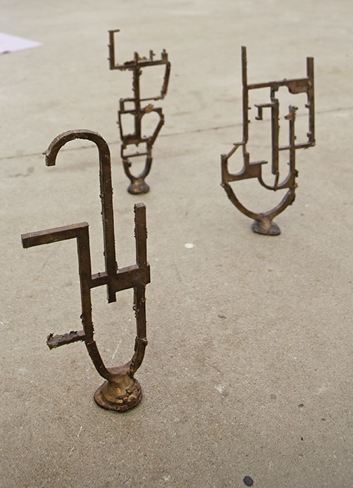 Diese Bronzen greifen den Grundriss der Villa Tugendhat von Mies van der Rohe als Vorbild auf (jede steht für eine der Etagen), wirken aber wie archäologische Funde, deren Bedeutung nicht entziffert werden kann. Für mich sind sie fast etwas wie Wegzeichen, von denen man nicht genau weiß, wohin sie einen schicken sollen.
