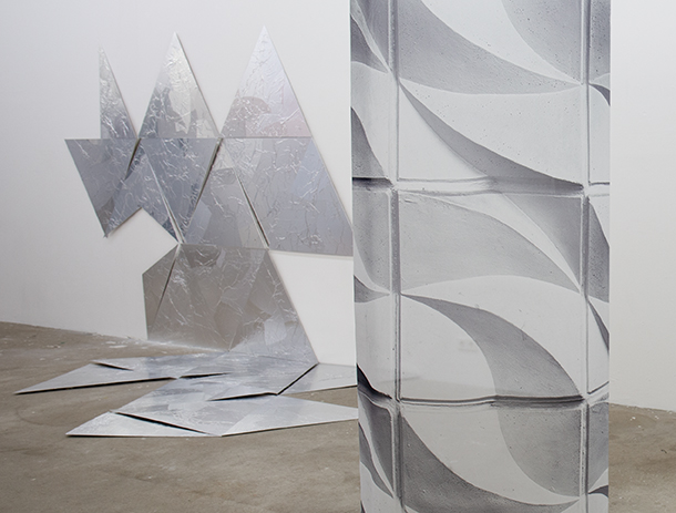 Seine Installation erforscht die Bezüge und Resonanzen rund um die Idee der Verschmelzung der Künste und zeichnet dabei die ästhetische Sprache des Architekten nach – von der Intimität des Interieurs bis zur kristallinen Geometrie der Facettierung, von formaler Strenge bis zur Üppigkeit des Dekorativen.